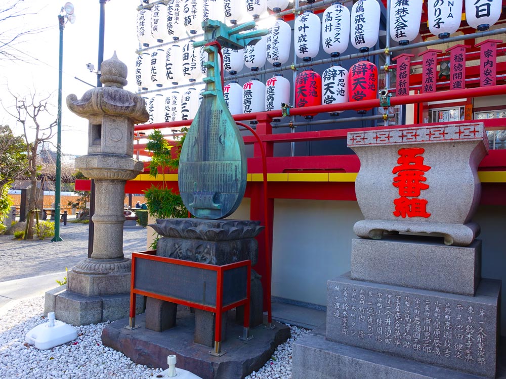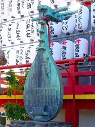 芸能の神とも言われる辯才天は、琵琶を持った姿が有名。この石碑の琵琶にはよく見ると弦が張ってある。