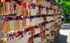 本堂と大黒天前には「角塔婆」が建てられており、それぞれご本尊と結ばれていて、これに触れながらお参りすることで功徳を得ることが出来ると言われている。お参りする際には、是非この角塔婆に触れてお参りしていただきたい。