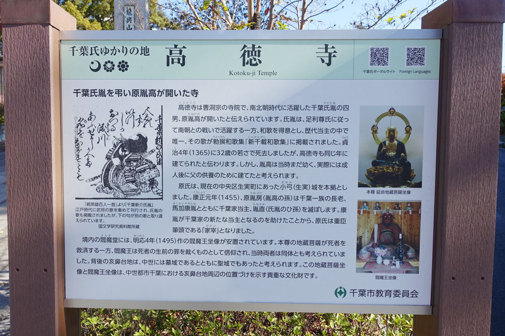 高徳寺は曹洞宗の寺院で、南北朝時代に活躍した千葉氏胤の四男、原胤高が開いたと伝えられています。氏胤は、足利尊氏に従って南朝との戦いで活躍する一方、和歌を得意とし、歴代当主の中で唯一、その歌が勅撰和歌集『新千載和歌集』に掲載されました。貞治4年(1365)に32歳の若さで死去しましたが、高徳寺も同じ年に建てられたと伝わります。しかし、胤高は当時まだ幼く、実際には成人後に父の供養のために建てたと考えられます。