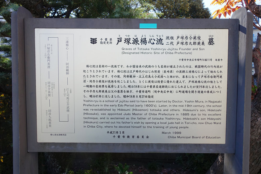 楊心流は柔術の一流派です。わが国古来の武術のうち柔術が確立されたのは、戦国時代の竹内流が起こりとされています。楊心流は江戸時代のはじめ肥前 (長崎県)の医師三浦楊心によって始められたとされています。その後、阿部観柳・江上司馬之介武経へと継がれ、幕末になって戸塚彦右衛門英澄・同彥介が流派を起こしました。とくに英俊は技量に優れた達人で、戸塚派揚心流の祖として一時期の柔術界を風靡しました。明治18年には千葉県柔道師範に往じられましたが翌19年没しました。その子彦九郎英美は父の意思を継ぎ、千葉市通町 (現中央区中央) に町道場を開き後進の養成につくし、明治41年に没しました。昭和18年8月27日指定