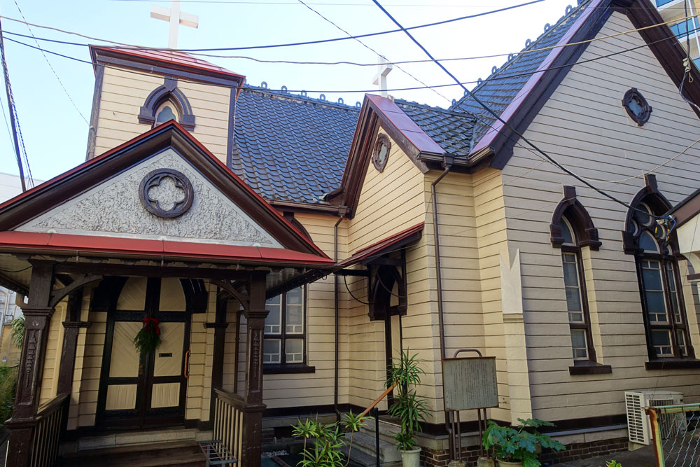 この教会堂はヨーロッパから米国東部地方へ移って簡略化されたカルヴィン系教会の様式で、外見は洋風下見板張り、ゴシック風アーチ型の窓、天井は高い折上天井風、太く黒い柱などから成り、装飾の彫刻は簡単であるが洋風技術のすぐれた特色がみられる。
