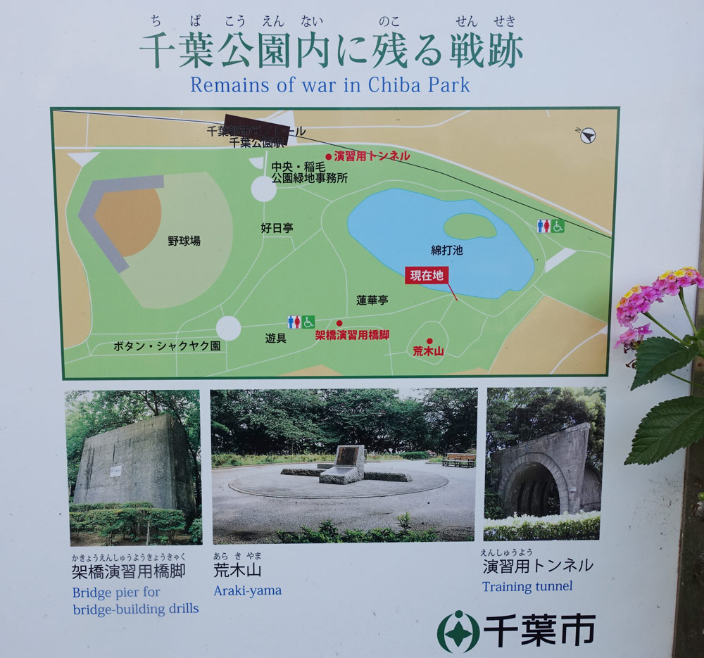 明治41年(1908年) 6月の交通兵旅団と鉄道聯隊第二大隊の椿森移転以来、本市には、陸軍歩兵学校、気球聯隊など多くの陸軍施設が中央区 (椿森、弁天) や稲毛区 (作草部、天台、穴川、小仲台、園生) の台地に集積し、その総面積は約462ヘクタール(約140万坪) に及びました。現在、跡地は、学校や公園、公共施設などに利用されています。千葉公園は昭和21年(1946年)6月に戦災復興計画により公園造成が決まり、建設されました。 綿打池付近から千葉東高校南側付近までの一帯が鉄道第一聯隊の演習用作業場であったことから、現在でも架橋演習のための橋脚やトンネルが残されています。