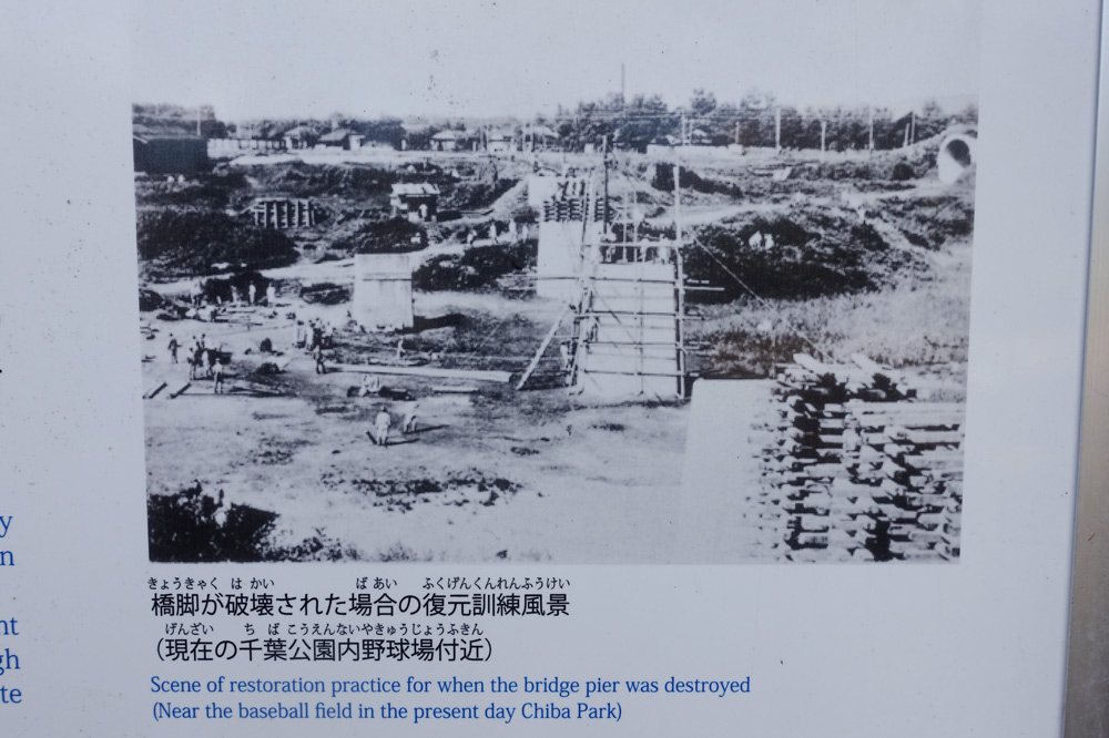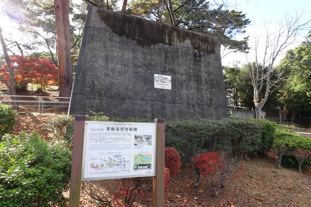 大正7年(1918年)、鉄道聯隊の改編により千葉町に鉄道第一聯隊、津田沼町に第二聯隊が設置されました。現在の千葉公園綿打池付近から千葉東高校南側付近までの一帯は、鉄道第一聯隊の演習用の作業場となっていました。このコンクリート製の橋脚は架橋演習に使用されており、このほかにも、千葉公園内にはトンネル工事演習に使用されていたコンクリート製のドームが残るなど、昔日の面影を今に伝えています。