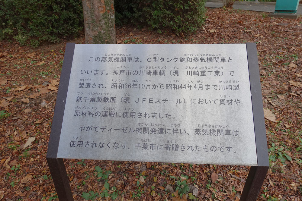 やがてディーゼル機関発達に伴い、蒸気機関車は使用されなくなり、 千葉市に寄贈されたものです。