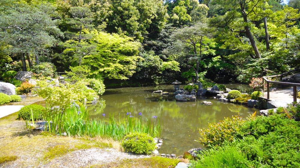 方丈庭園には菖蒲が見ごろを迎えており、鮮やかな彩を加えていた。