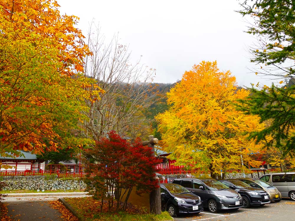 木々の紅葉と、真っ赤な楼門がマッチしていて美しい。