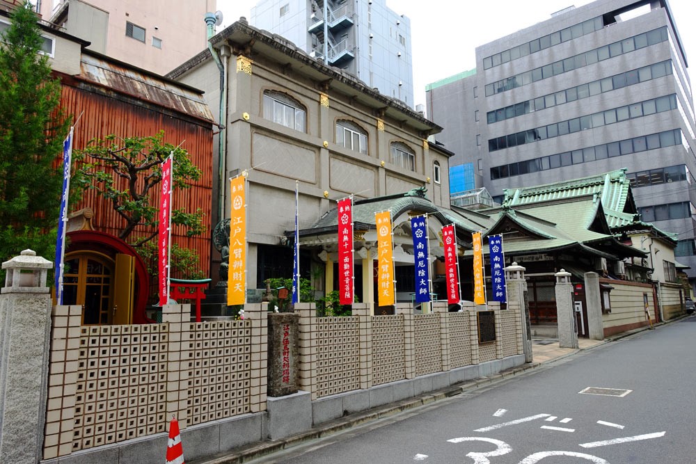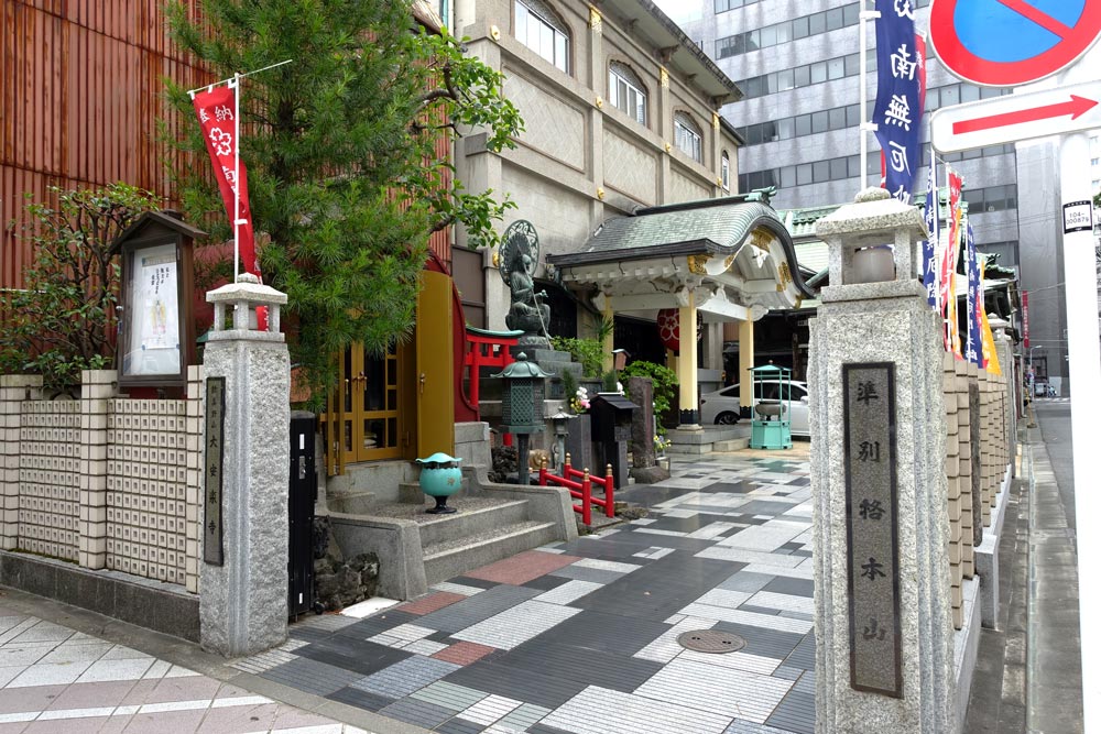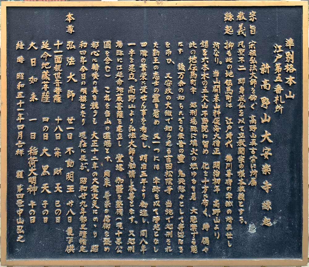 縁起 抑も此の地伝馬町は 江戸時代 徳川幕府の牢獄の所在せし所なり。当山開基山科俊海大僧正 明治初年 高野山より 錫を六本木の五大山不動院に留め 化を十万に布く 時 偶々此の地伝馬町牢 処刑場跡に燐火の燃ゆるを見 大悲禁ずる能はず 幾万余の知られざる無告の霊 鬼哭愁々として寄辺なきを弔ひ 又安政の大獄で知られる吉田松陰等 当地で処刑された勤王の志士の霊を慰め 又一つには 牢跡を以て浄地となし四鱗の繁栄に資せんことを布念し、明治五年より勧進し、同八年一宇を建立。高野山より弘法大師を勧請し本尊となす。又処刑場跡には延命地蔵菩薩を建立し 堂塔 伽藍を整備(現十思公園を含む) これを当山の濫觴とす 爾来 尊崇の信仰を聚め都心に輪喚の美を競うも 大正十二年の大震火災にかゝり 昭和四年今日の規模となり 現在に及ぶ。昭和廿九年都史蹟指定