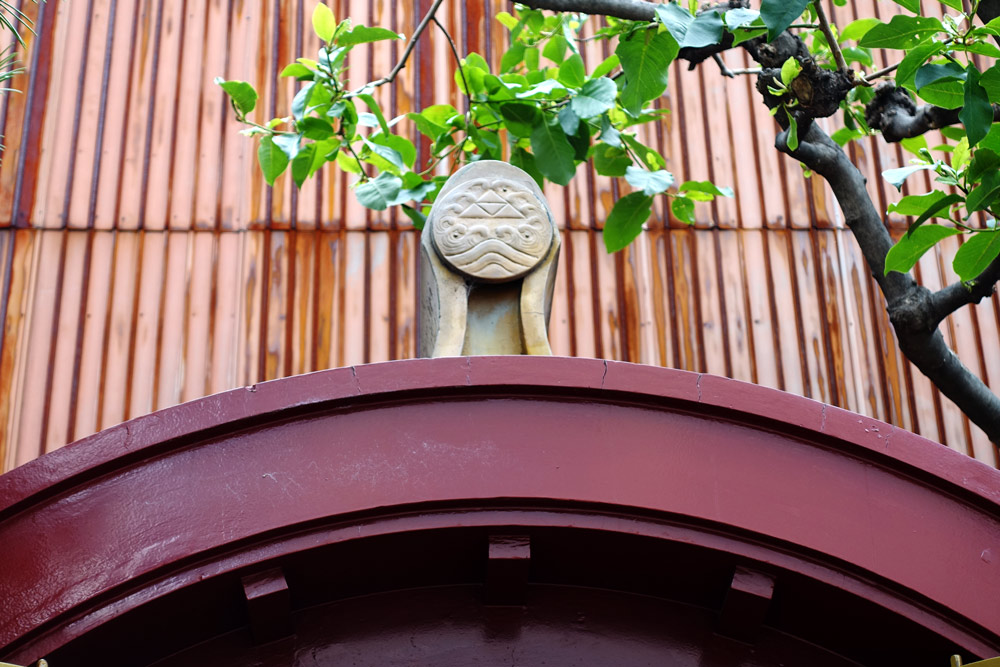 屋根の上に、何やら見たことのある家紋のような文様を発見。よく見ると、中に北条家の家紋「三つ鱗」が彫りこまれている。調べてみると、この弁財天は江の島から譲られたとのことで、北条政子によって造られたのだそう。ここにも、頼朝と北条氏の足跡を見ることが出来るとは面白い。