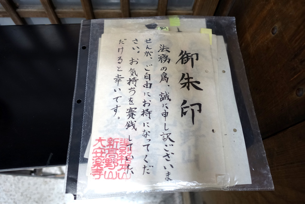 参拝した日は、お寺の方が不在のようで、書置きの御朱印を束ねたファイルが置かれていた。