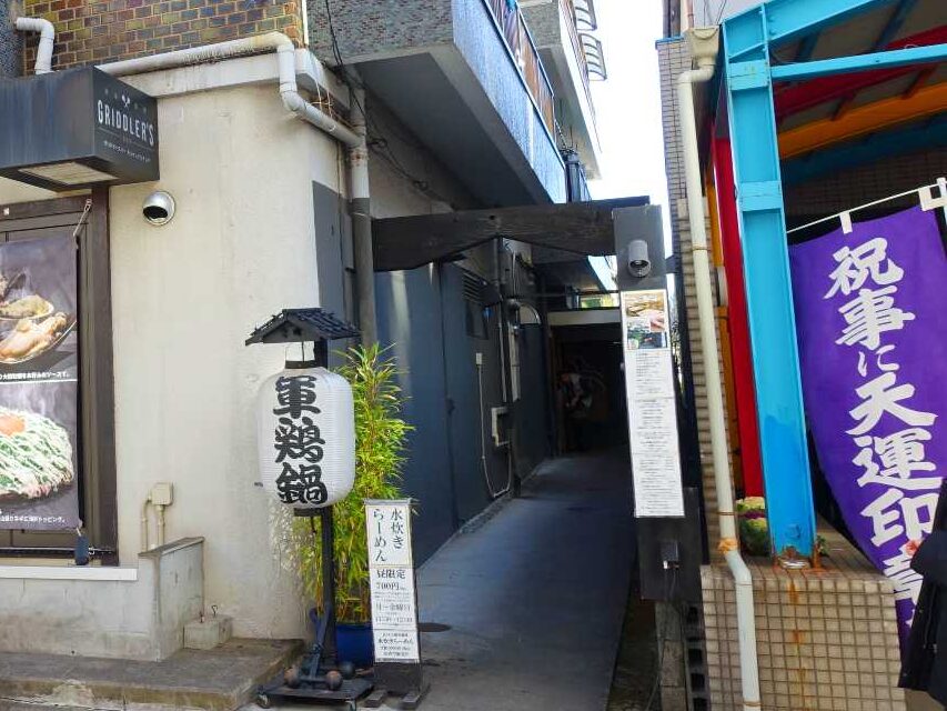 少しわかりづらいが、「軍鶏鍋」の大きな提灯を目印にして、奥に伸びる細い路地を少し進むとお店の入り口となる。