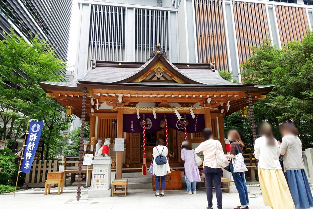 オフィス街の一角に位置する神社の朱色の鳥居は、周囲とのコントラストが美しく映える。