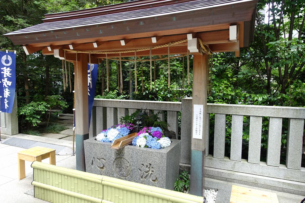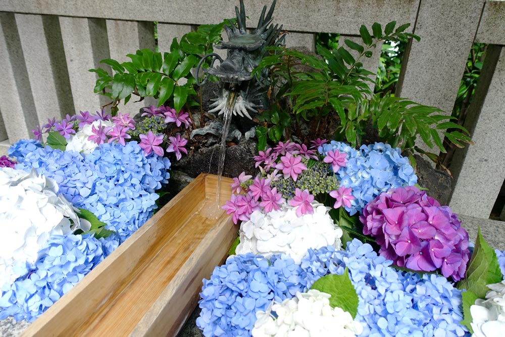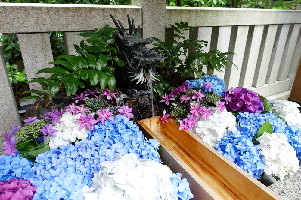 参拝日が6月だったので、ちょうど見ごろの紫陽花が飾られていた。どことなく、龍も喜んでいるように見える。