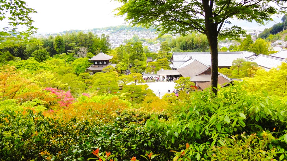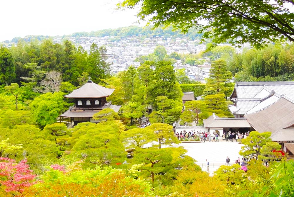 小高い丘に登ると、静かな緑に包まれた中から銀閣寺と京都の街並みが一望できる。秋の紅葉の季節には、きっと美しく赤く染まった木々と銀閣寺を臨めるのだろう。写真を見てもわかるように、多くの観光客が訪れる、人気の観光スポットだ!