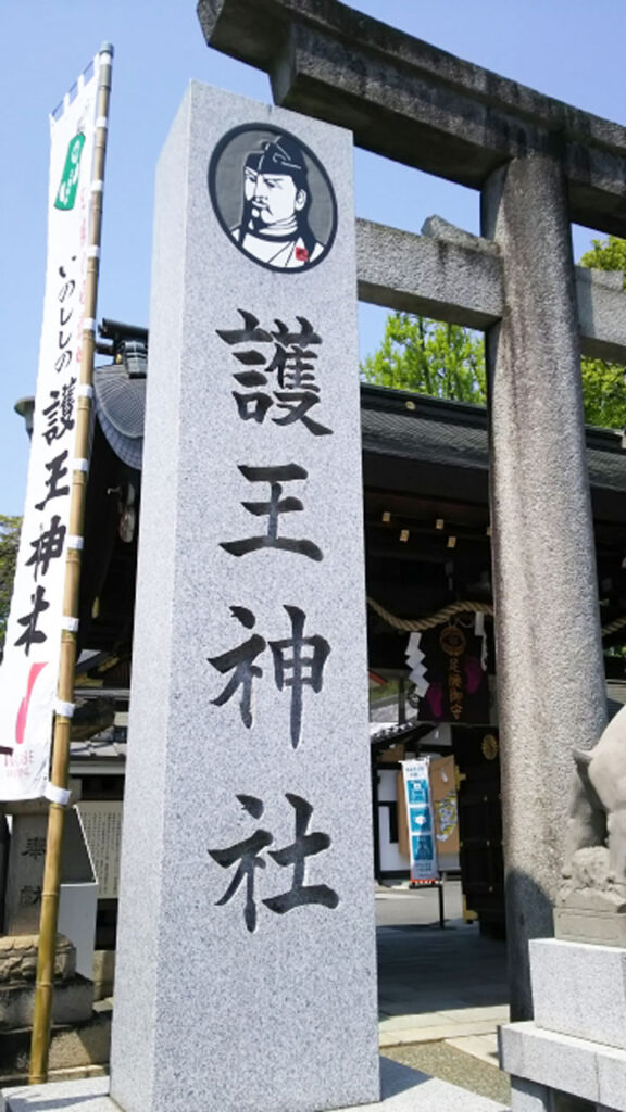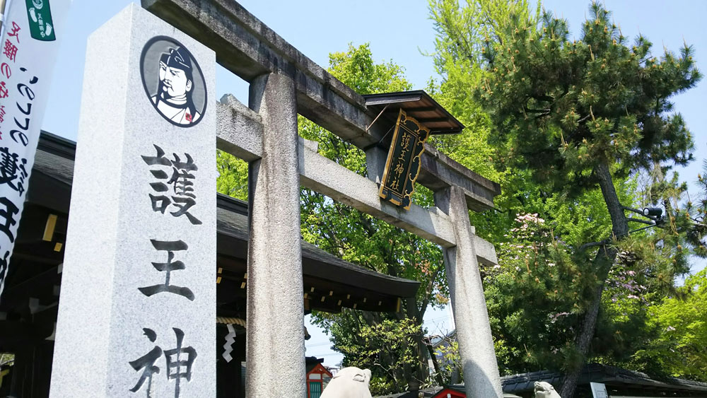 護王神社と刻まれた標柱。顔は、和気清麻呂。凛々しい顔つきだ。