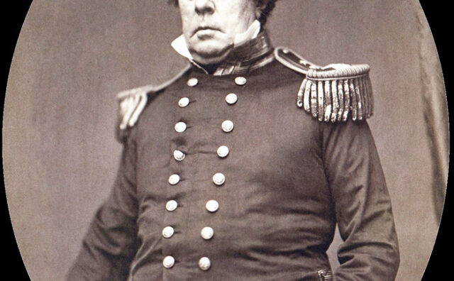 ペリー提督黒船陸戦隊調練の図。しっかりと了仙寺の本堂が描かれている。