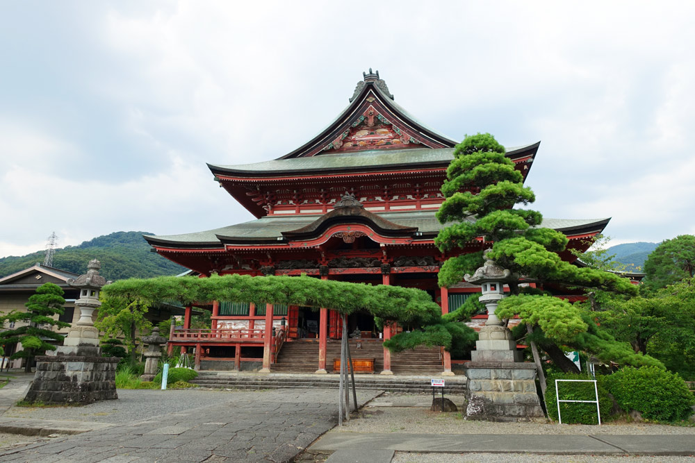 この金堂は高さ27メートル、奥行き49メートルで、善光寺建築に特有の撞木造と呼ばれている。