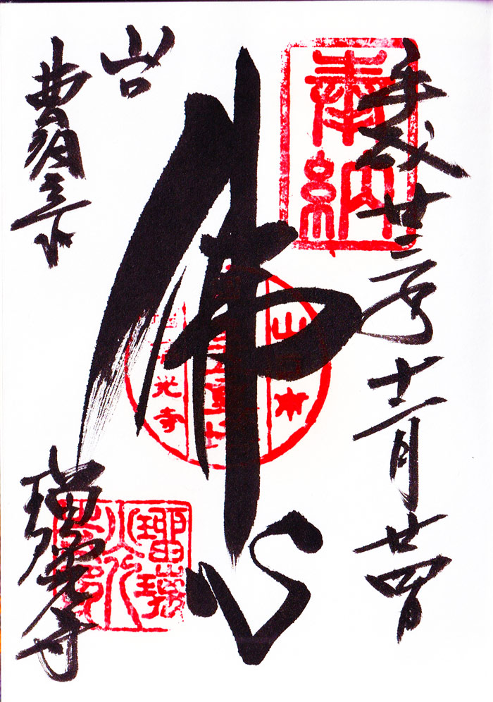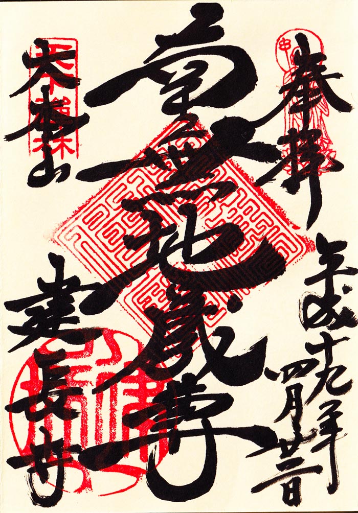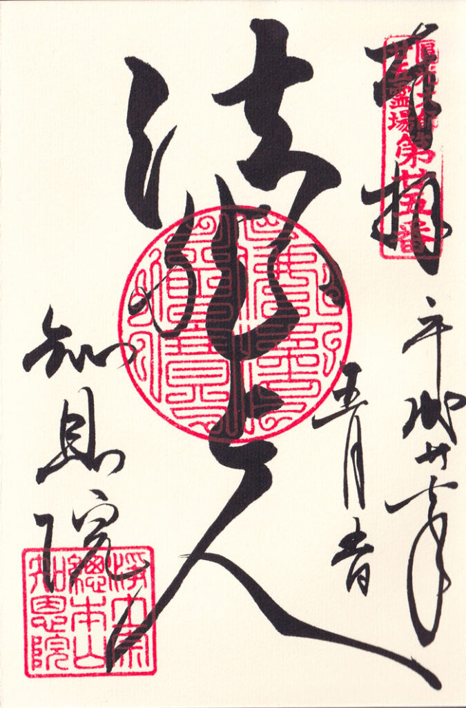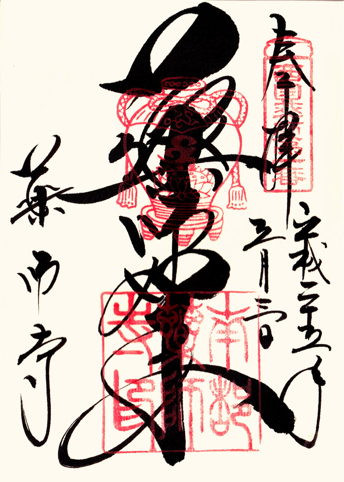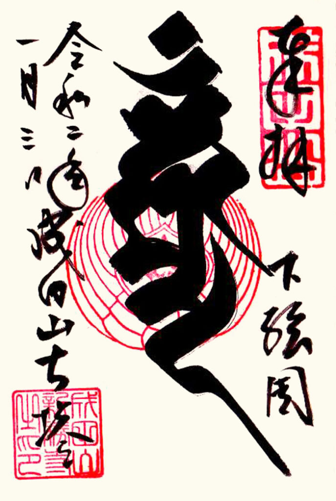 本尊「不動明王」の文字と、梵字「カン」の印が押されたこの御朱印のバランスがとてもカッコいい。不動明王の姿が文字に乗り移っているような印象さえ受けるのだ。