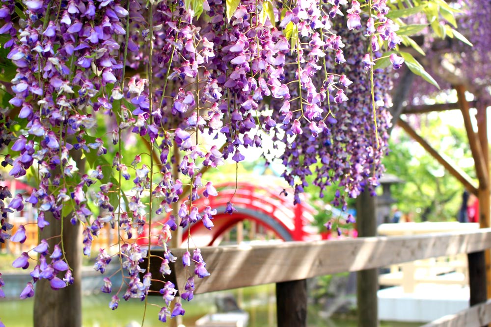 ゴールデンウィーク前後は藤の花が満開を迎える。藤棚に一杯咲いている景色は圧巻。