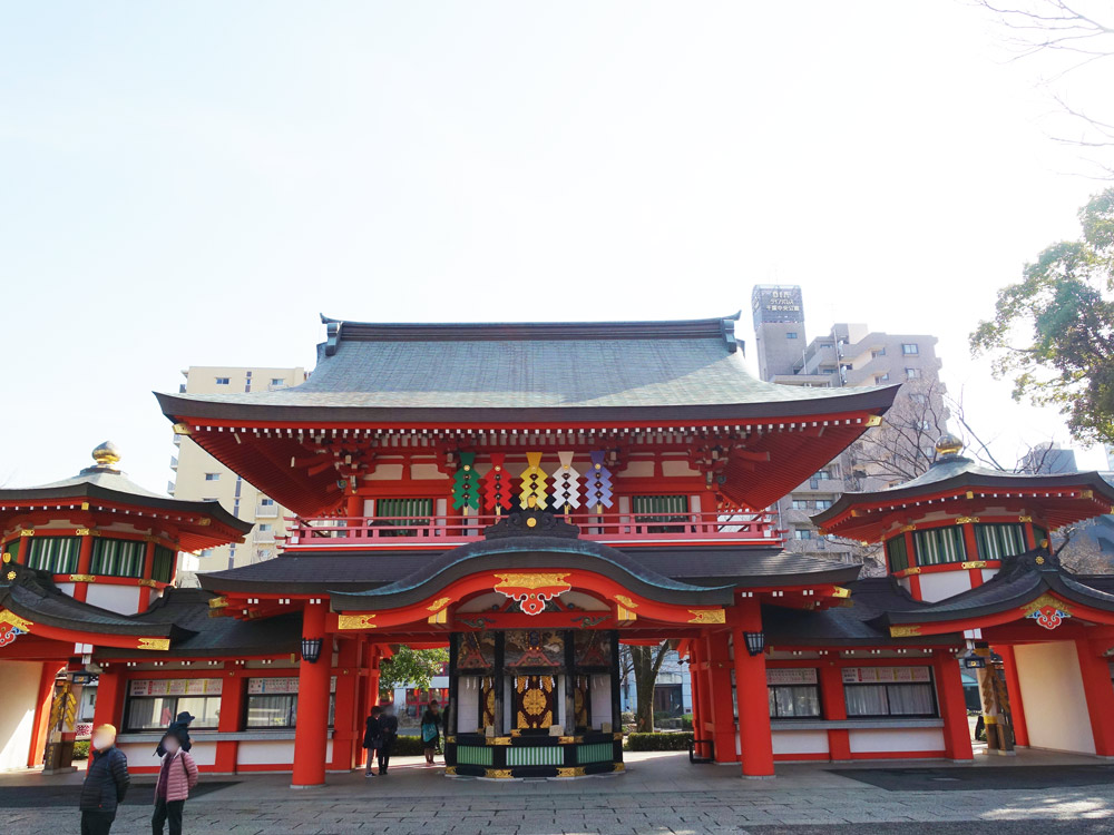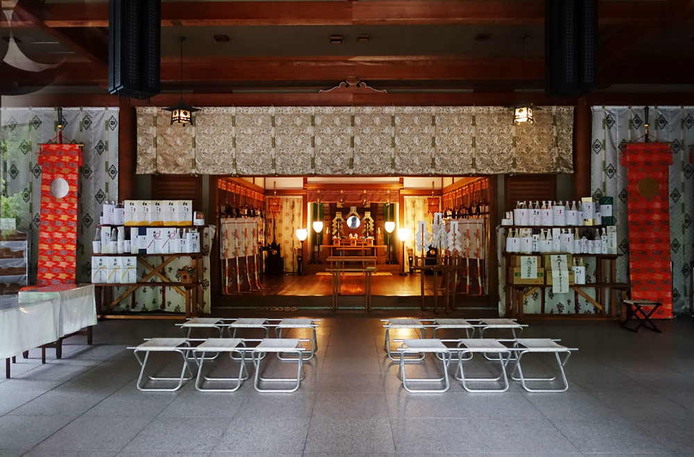 1990年に再建した御社殿は、国内初の上下に二つの拝殿がある重層社殿となっている。混雑しているときは、2階へ行ってみると意外と空いていたりする。