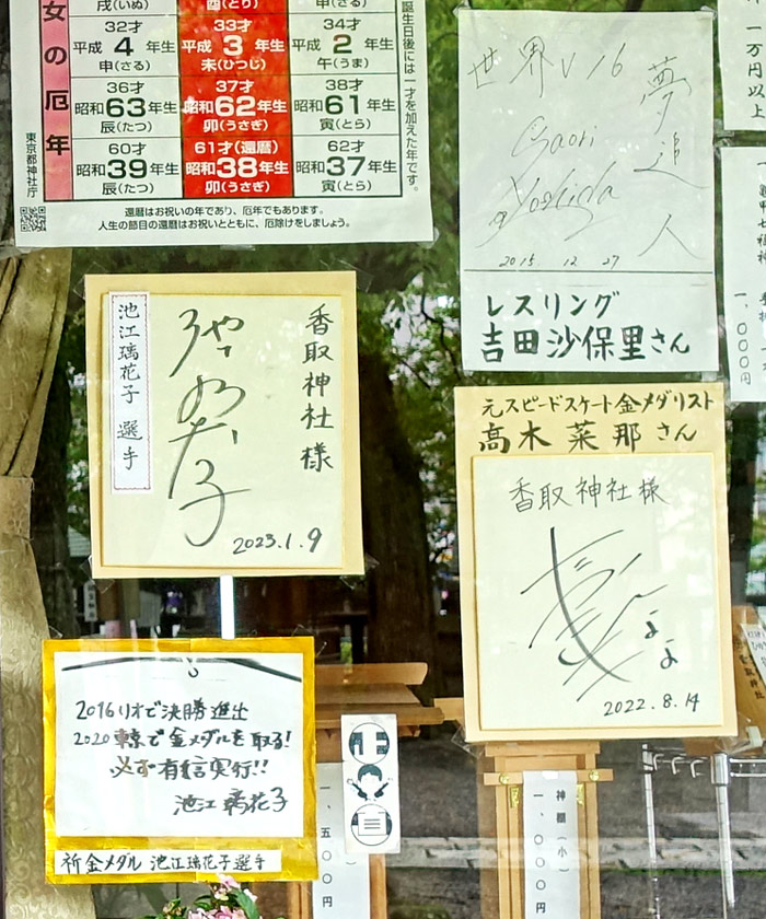 水泳の池江璃花選手や、レスリングの吉田沙保里選手、スピードスケートの高木奈那選手など、名だたる選手がここ香取神社で祈願しているようだ。