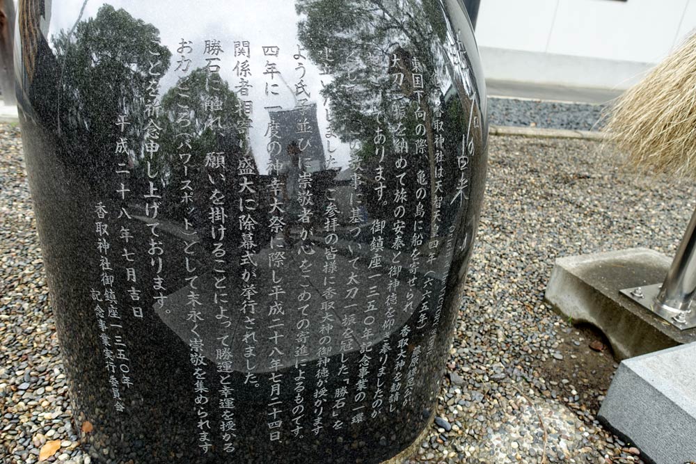 ご鎮座1350 年の記念事業として建立された、パワースポットの「勝ち石」。
