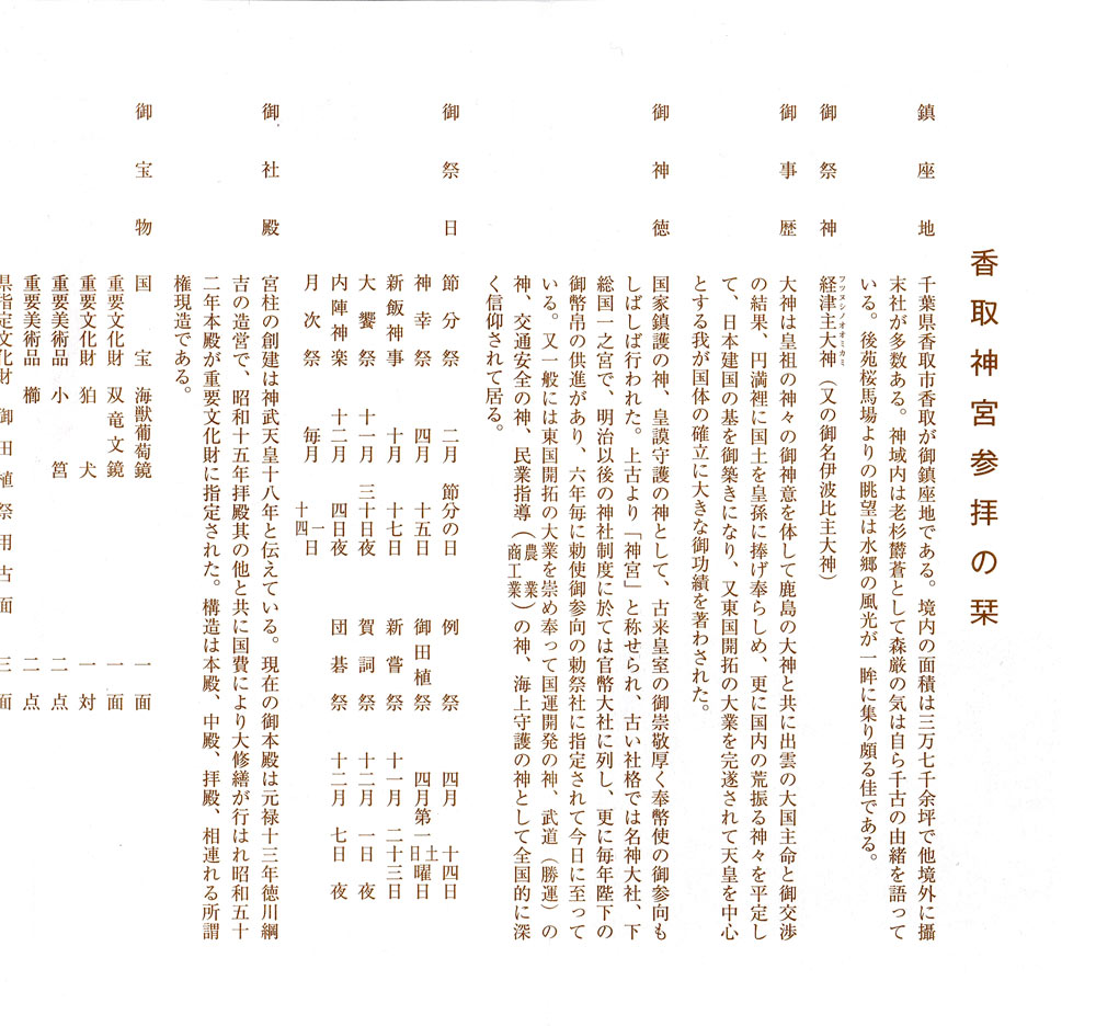 平安時代の延喜式神名帳に「神宮」という称号で記されていたのは、伊勢、香取、鹿島の3社だけである。