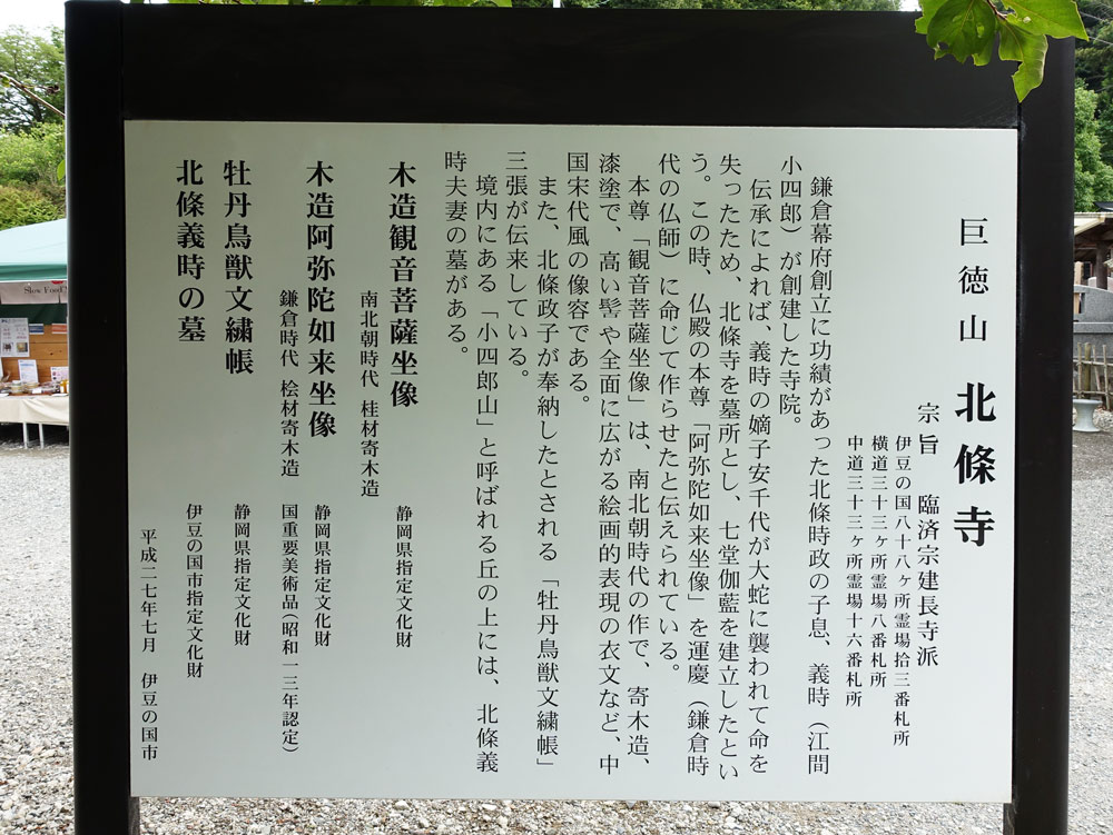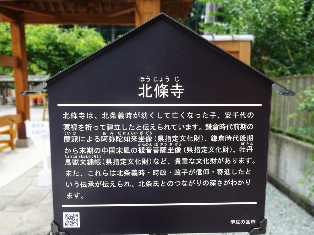 北條寺は、北条義時が幼くして亡くなった子、安千代の冥福を祈って建立したと伝えられています。 鎌倉時代前期の慶派による阿弥陀如来坐像 (県指定文化財)、鎌倉時代後期から末期の中国宋風の観音菩薩坐像 (県指定文化財)、 牡丹鳥獣文繍帳 (県指定文化財) など、 貴重な文化財があります。また、これらは北条義時 時政・政子が信仰 寄進したと