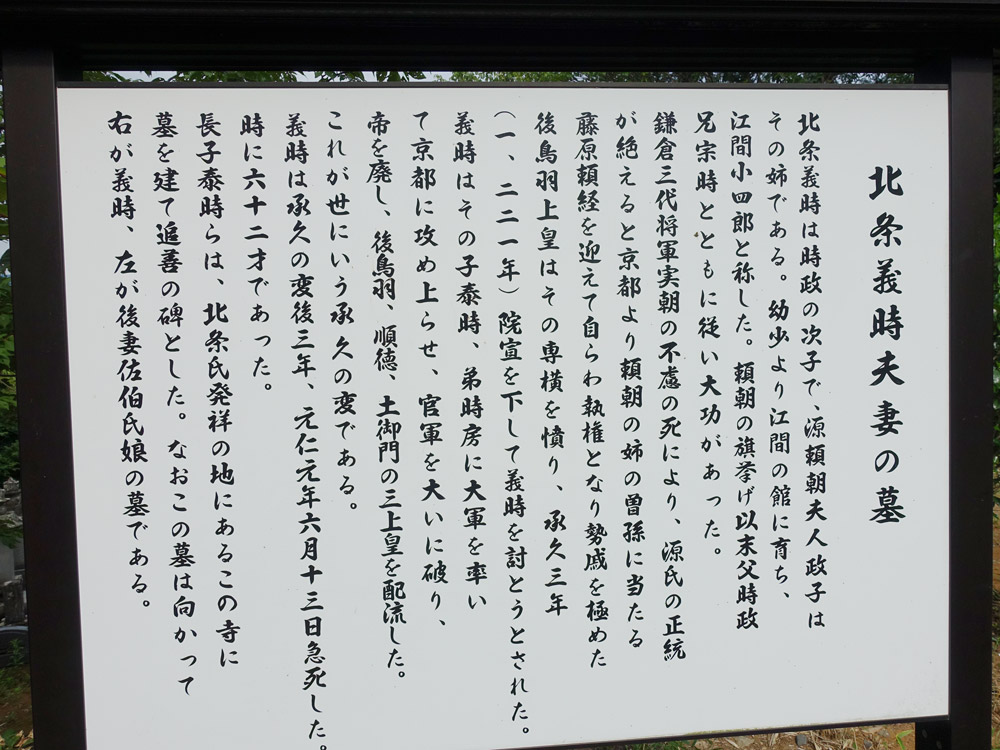 長子泰時らは、北条氏発祥の地にあるこの寺に墓を建て追善の碑とした。なおこの墓は向かって右が義時、左が後妻佐伯氏娘の墓である。