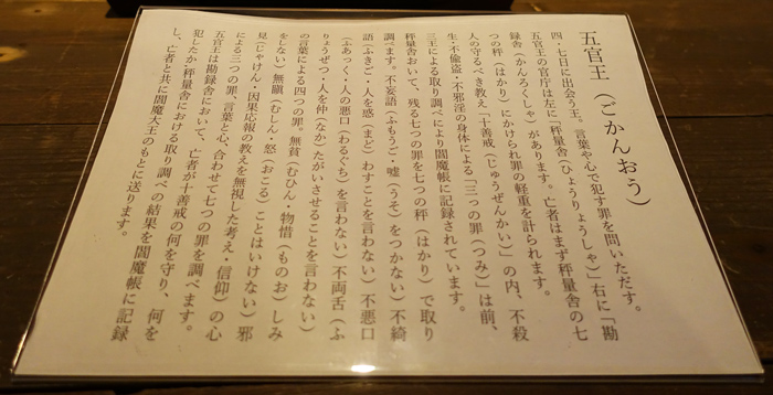 - 人が亡くなると、遺族によって、葬式・初七日・四十九日・一周忌・三回忌・・と法要を行うが、この法要ごとに各王の庁舎で亡者の罪状に裁きを下す裁判が行われる。