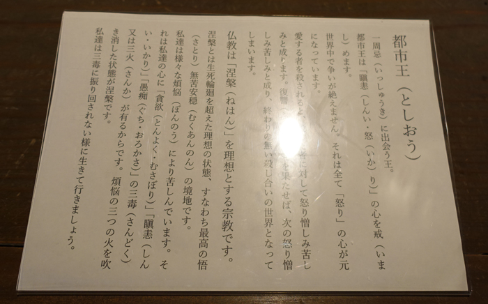 都市王は「瞋恚(しんい・怒(いか)り)」の心を戒(いまし)めます。