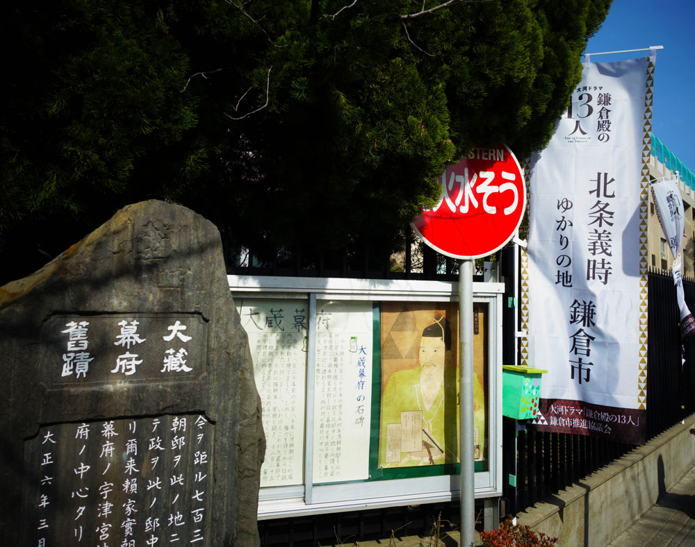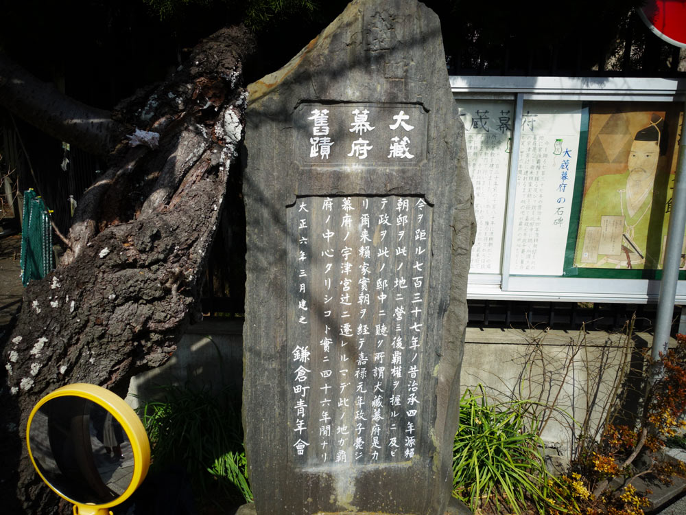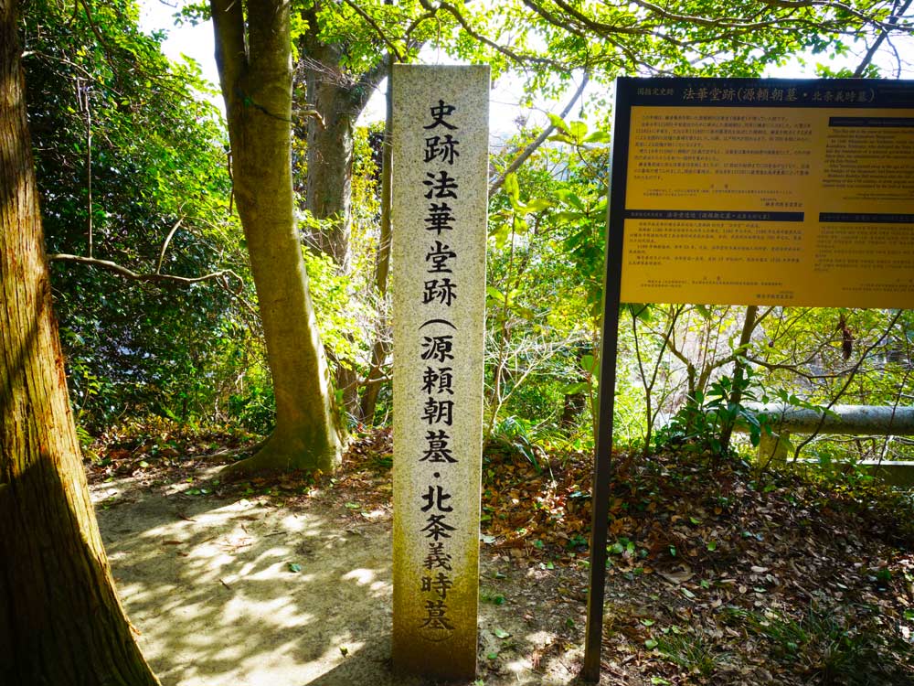 鎌倉幕府の跡地には、石碑がひっそりと佇んでいる。頼朝がここに居を構え幕府を開いてから、北条政子が亡くなるまで、この地が幕府の中心地だったことが記されている。