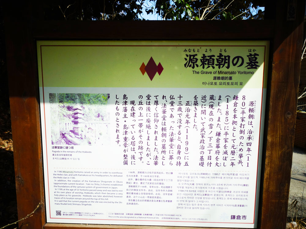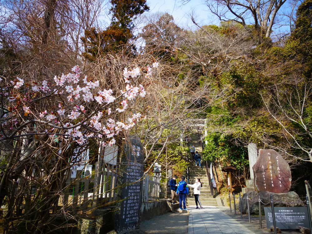先ほどの小学校の先に、「源頼朝」の墓所がある。少し小高い丘の上に建てられている。写真はそのふもとから。春先に訪れたので、桜の花がわずかに咲いている。