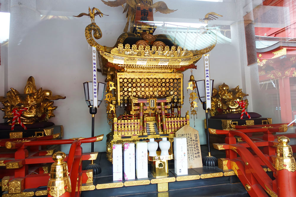 鳳輦と書いて「ほうれん」と読む。鳳輦神輿とは、屋形の上に鳳凰を乗せた神輿のこと。通常は非公開だが、お祭りの時には公開され担がれる。