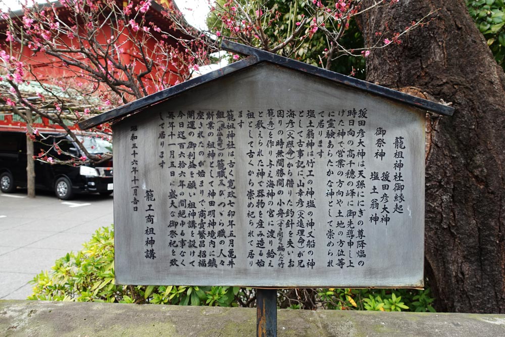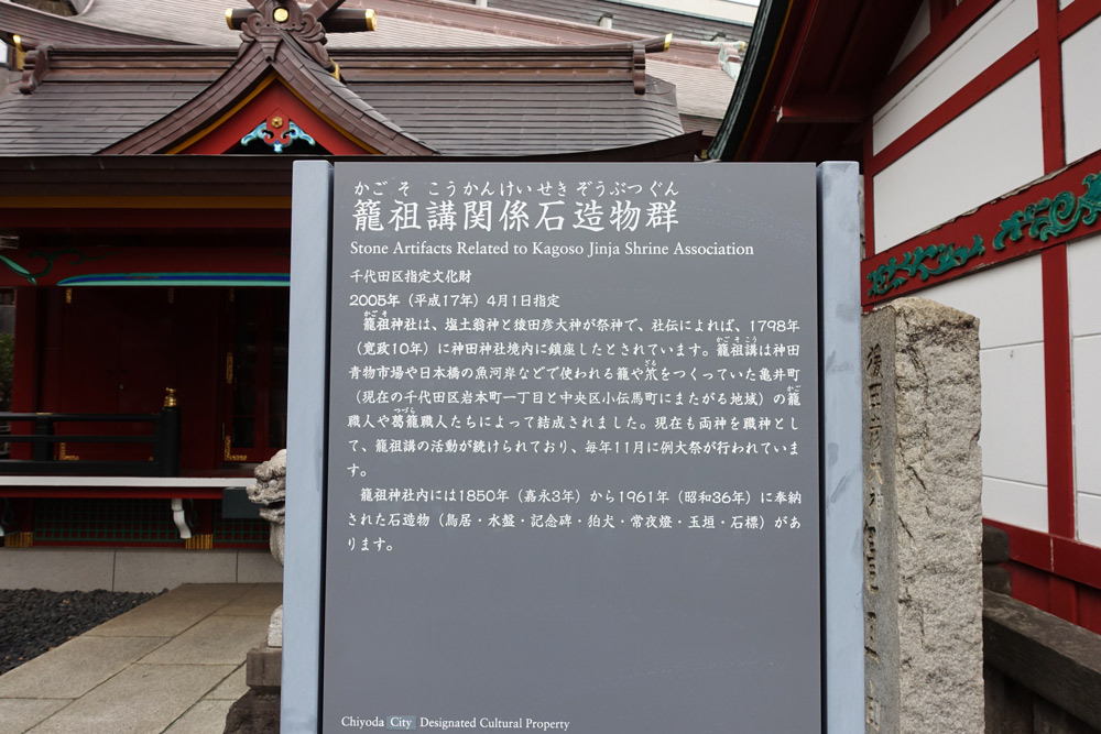 籠祖神社は、塩土翁神と猿田疹大神が祭神で、社伝によれば:1798年 (寛政10年)に神田神社境内に筑座したとされています。籠祖講は神田青物市場や日本橋の魚河岸などで使われる籠や笊をつくっていた亀井町 (現在の千代田区岩本町一丁目と中央区小伝馬町にまたがる地域)の籠職人や葛籠職人たちによって結成されました。現在も両神を職神として、籠祖講の活動が統けられており、毎年11月に例大祭が行われています。