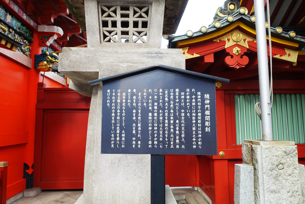 随神門四方の欄間彫刻は四神が彫られ、中央部には御祭神大國主之命の神話が描かれている。