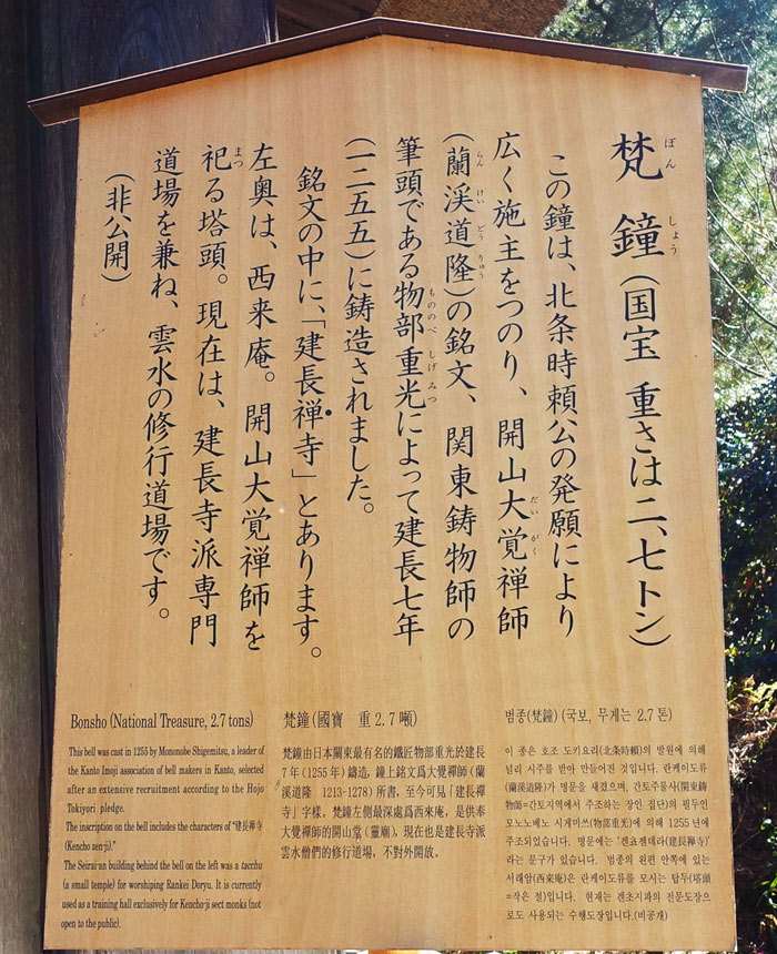 北条時頼の発願により関東鋳物師の筆頭「物部重光」により鋳造されたとのこと。建長寺創建当時から残る、貴重な梵鐘だそう。