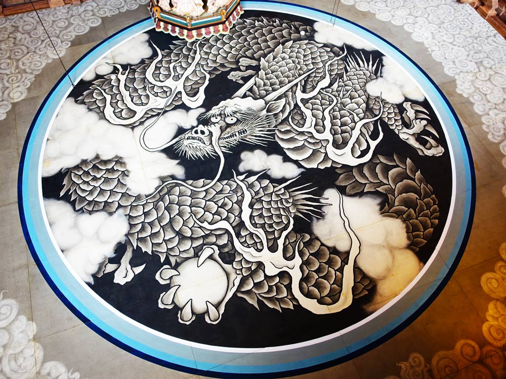 法堂天井に雲龍図が上げられるのは理由があります。もともと法堂とは住職が壇上に上がり仏教の教えである「法」を説く場所でした。そして、龍は大自然の力を秘め、雲を呼び雨を降らすと言われておりました。「法堂で住職の説法を聞く人々に “法”の雨が降りそそぎ、染み渡るように」との願いが込められて、雲龍図が掲げられているのです。
