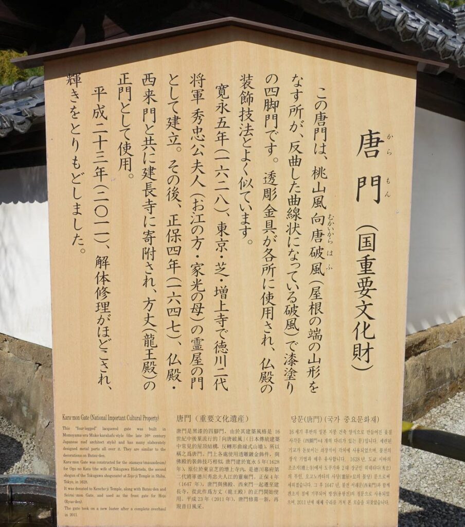 この立派な唐門は、1628年、東京・芝・増上寺で徳川二代将軍秀忠の夫人「お江の方」の霊屋の門として建てられ、当時の豪華な造りを間近で見ることが出来る。増上寺の敷地内であれば恐らく間近で見ることは叶わないだろうから、とてもありがたい。また、東京に建てられたままであれば大空襲で焼失した可能性もあるので、移築されたことにより今その姿を見ることが出来るというのは奇跡ではないだろうか。