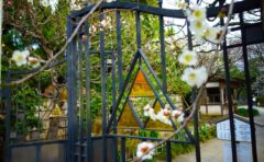 通路に腰掛ける椅子があるので、しばし庭を眺めながら休憩・・。この椅子があるおかげで、疲れが癒されるのでとてもありがたい。