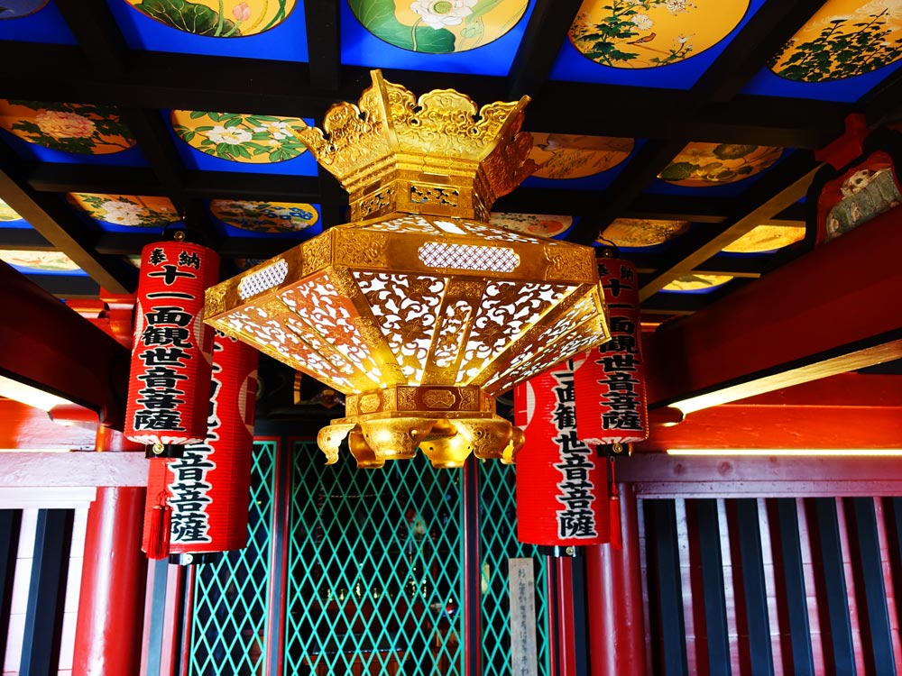 内部はまだ新しく、きらびやかな装飾が施されていて、目を楽しませてくれた。実はこのお堂、奈良時代に建立されたのだが、江戸時代からの度重なる火災や地震の被害に遭い、そのたびに修復や建て替えを余儀なくされてきたそうだ。このお堂は大正14年には再建されたそうだが、平成28年に大改修を経て今の姿になったとのこと。どおりで綺麗な状態なわけである。