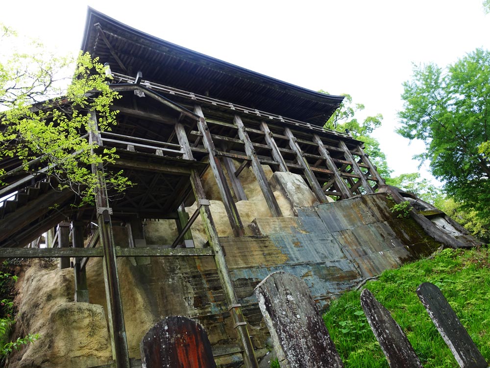 お参りが終わったので、下へ降りてぐるりと観音堂を回ってみる。下の方はコンクリ補強されているものの、岩の上に作られていることがよくわかる。すごいところに作ったなあ。