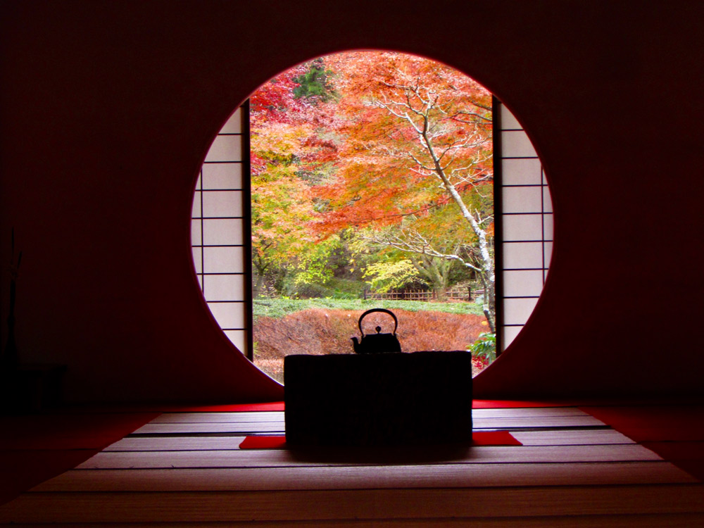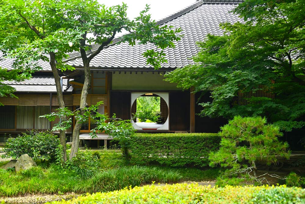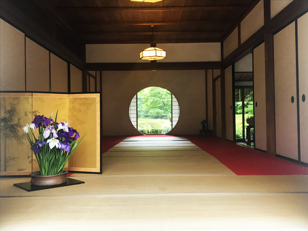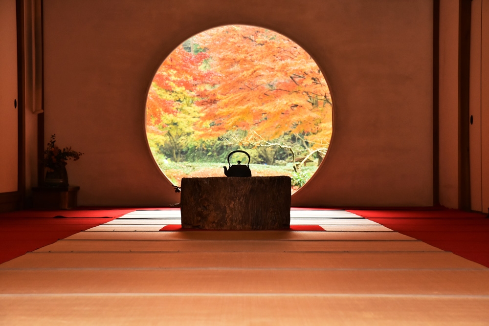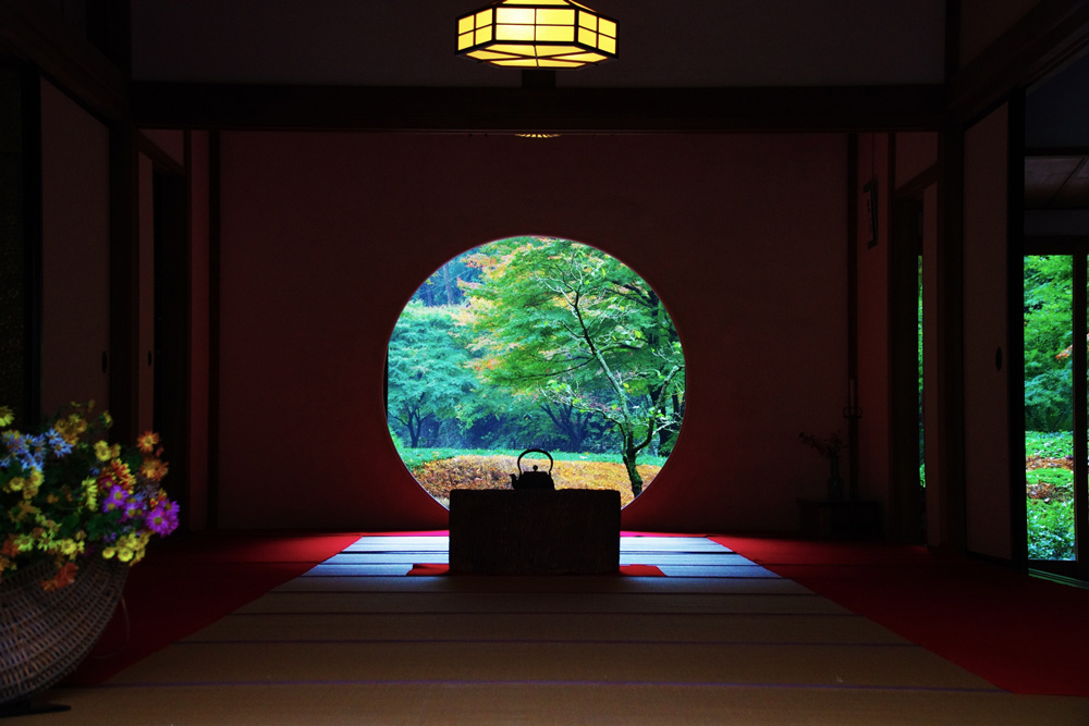 部屋の中を覗き込むと、奥に丸い窓が誂えられている。その窓からは、季節や時間によって変化する、風情ある景色が広がっているのだ。