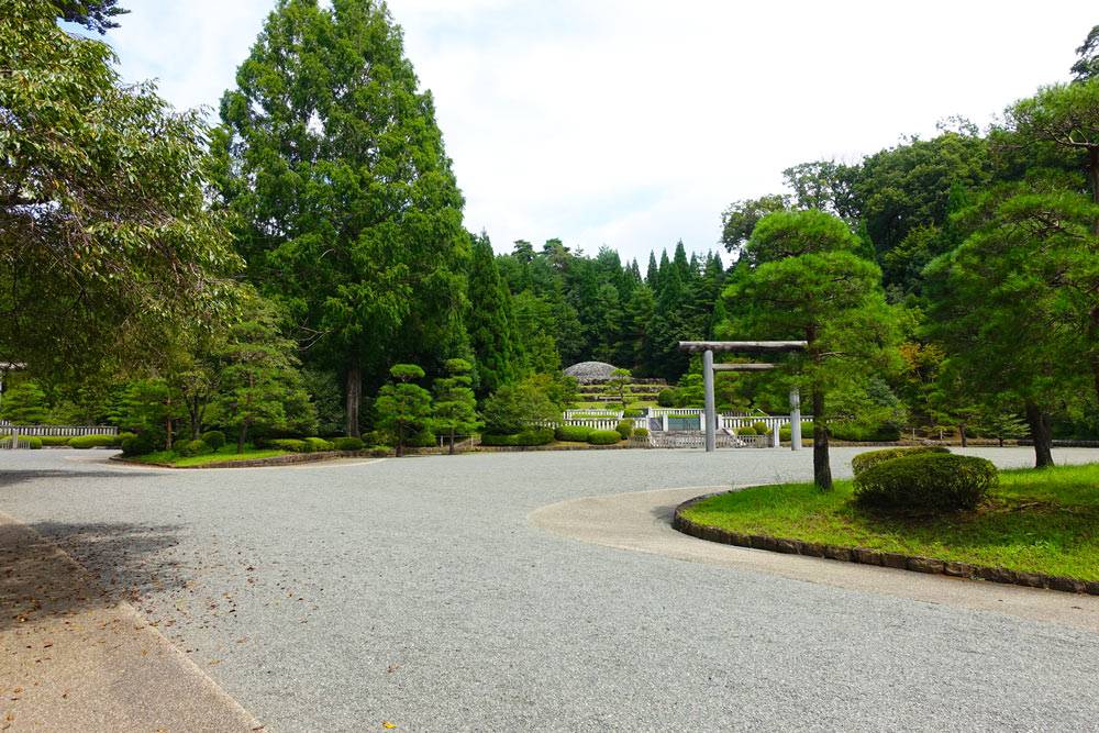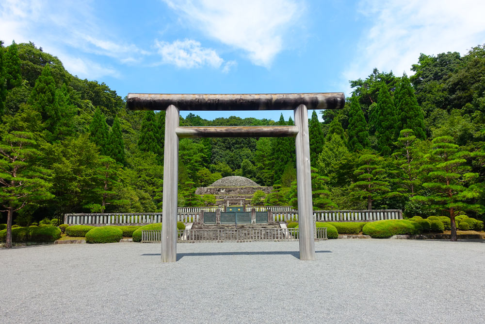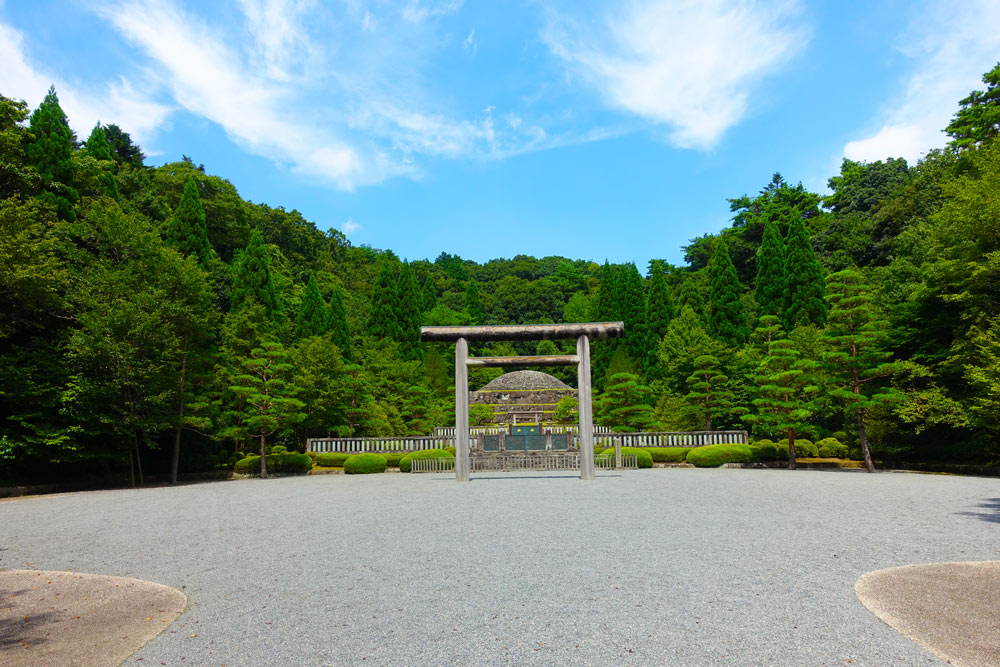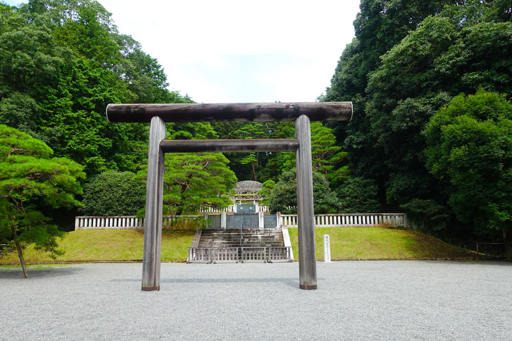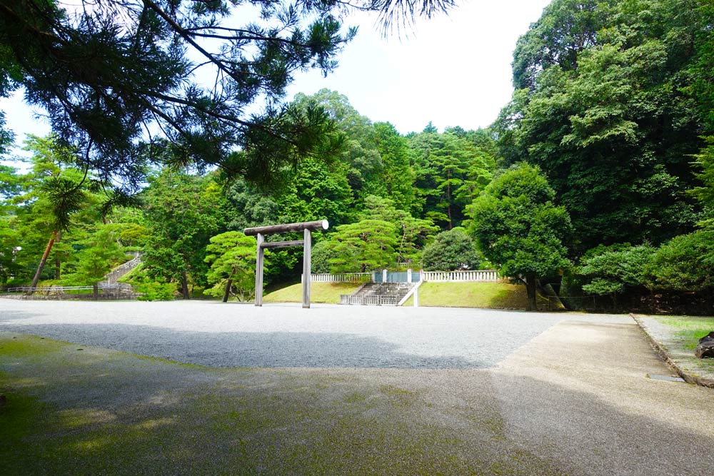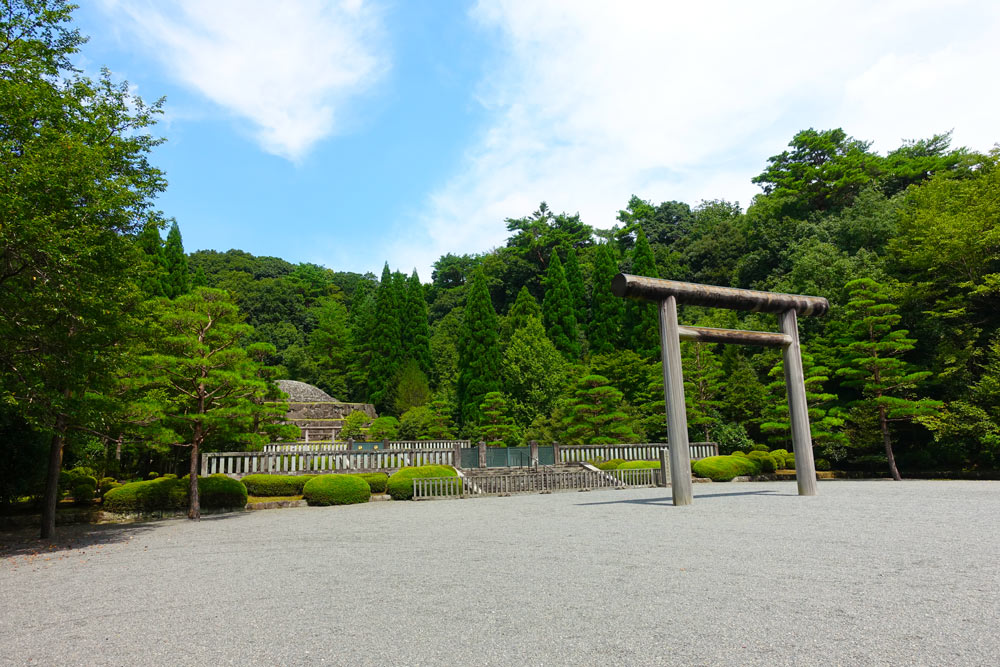 鳥居の奥に陵墓が見え、さらに向こう側は大きな森が包み込むように広がる。
