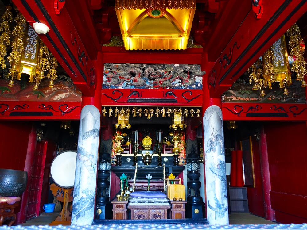 柱や欄間に龍の姿が描かれている。水の守り神を意味しているのだろう。