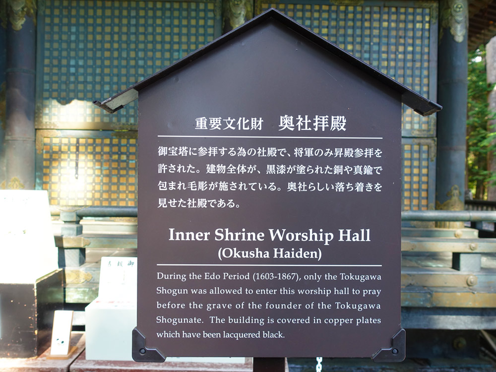 階段を登り切った先に、奥社が姿を表す。建物全体が黒漆の塗られた銅や真鍮で包まれているのだそう。陽明門などの煌びやかな造りとは打って変わって、重厚感のある落ち着いた造りになっている。