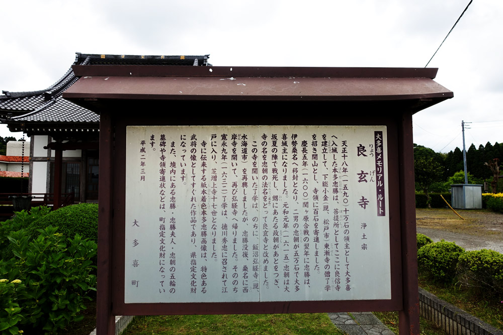 慶長五年(一六〇〇)関ヶ原合戦の翌年に忠勝は、伊勢桑名へ移封となり、二男の忠朝が五万石で大多喜城主になりました。元和元年(一六一五)忠朝は大坂夏の陣で戦死し、甥にあたる政朝があとをつぎ、寺の名を忠朝の法名をとって良玄寺と改めました。