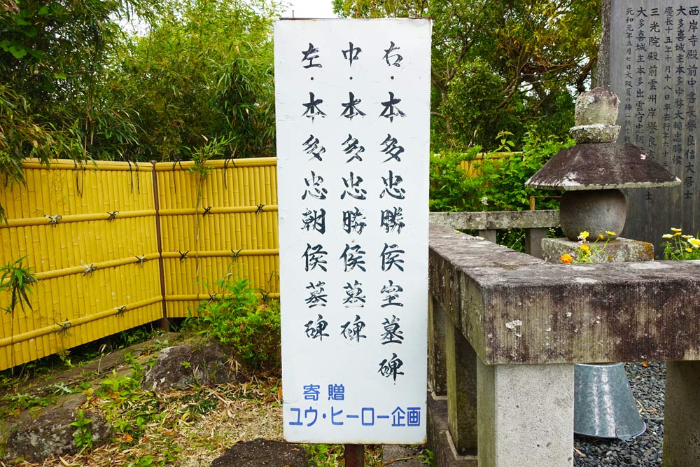 本多忠勝・忠朝の墓碑は、お寺右手「忠勝公園」の奥にある。
