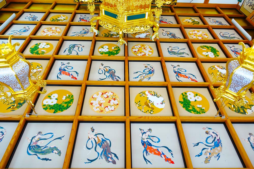 写真を反転するとこんな感じ。美しい天女と色とりどりの花や鳥たちが描かれている。