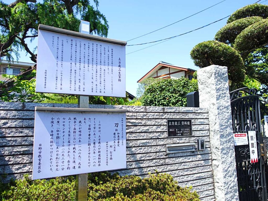 土方歳三資料館の入り口には看板が立てられている。建物自体は一般の住宅と変わらない。あくまで館長のご厚意で資料を開放してくださっている、という印象。