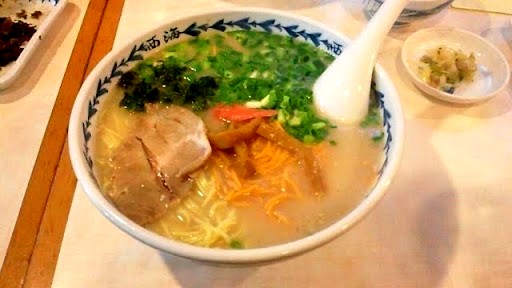 豚骨風味の中に、あごダシが利いていて魚介とんこつのようなうまみがガツンと来る。麺は細麺でこってりなスープがよく絡む。サラリと食べられるおいしいラーメン。